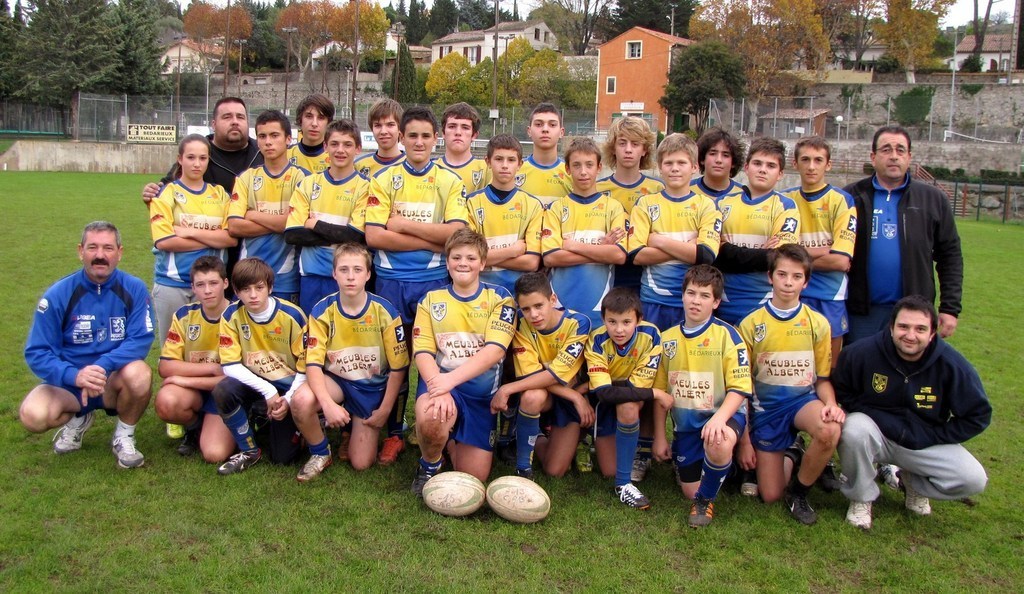 Ce week end du 17 mars les équipiers séniors sont au repos ( reprise dimanche 24 mars contre Plage d' Orb ) . Les cadets de l'entente continuent leur petit bonhomme de chemin et disputeront la demi-finale des Territoriaux contre St chinian à Lieuran( samedi aprés midi 15hs 30 ). L'école de rugby est sur le pont . Les moins de 7 ans sont déja rentrés en lice mercredi . Samedi 16 mars matin à René Char un plateau de qualité permetra de voir évoluer nos moins de 13 ans et nos moins de 15 ans . Samedi aprés midi les moins de 9 ans seront en déplacement à Murviel les béziers et les moins de 11 ans à Cessenon . ( photo les moins de 15 ans et leurs éducateurs )
