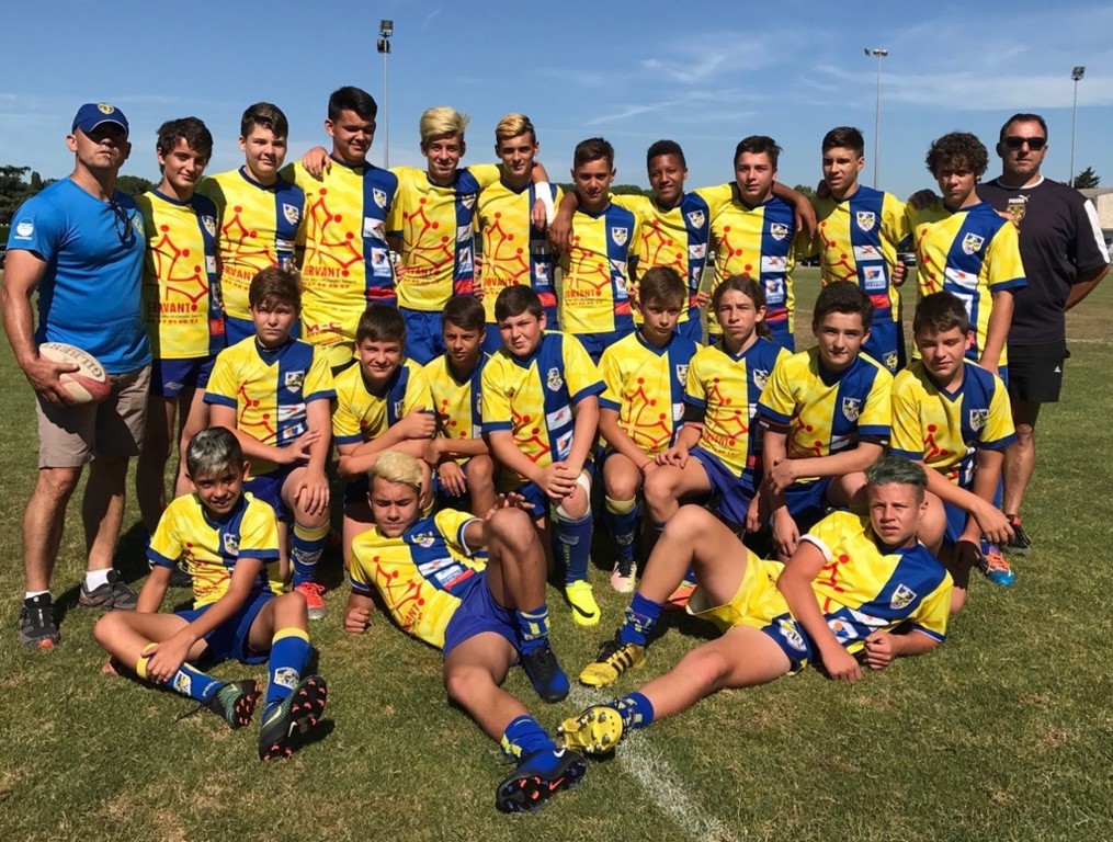 Beau succés pour le dernier tournoi de l'école de rugby , au tournoi des cheminots de Béziers . les jeunes joueurs jaunes et bleus obtiennent les résultats ci dessous : les moins de 8 ans : 5° , les moins de 10 ans : 1° , les moins de 12 ans : 3° et les moins de 14 : 1° . De plus au classement général l'école de rugby jaune et bleu a terminé 1°... ( photo les moins de 14 ans )