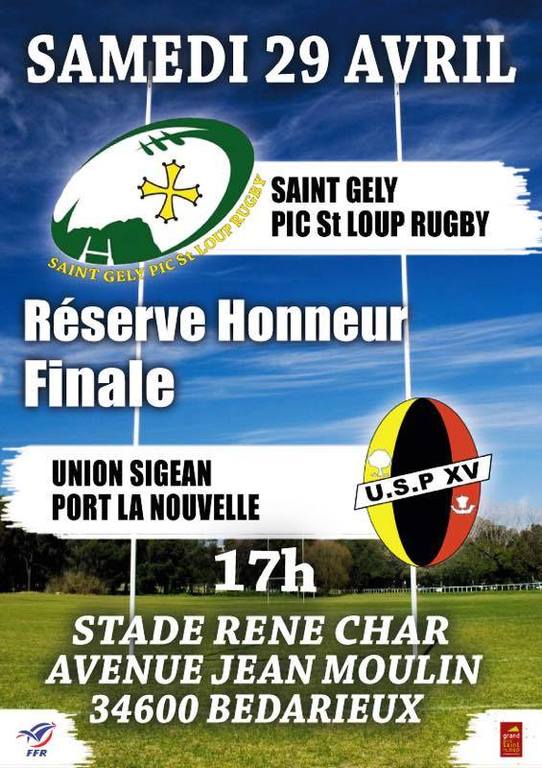 Au stade rené char samedi 29 avril à 17 fs 30 aura lieu la finale réserve honneur entre les équipes de Sigean et pic st loup ....