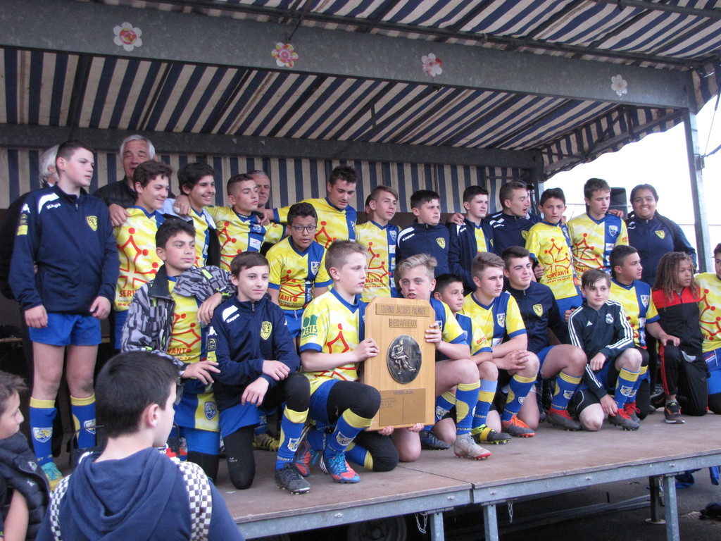 Plus de 250 joueurs , 10 équipes ,un beau temps , une organisation aux petits oignons ,3 arbitres officiels toutes les conditions étaient rassemblées pour faire de cette journée un beau Tournoi Jacques Palmade .. Les joueurs jaunes et bleus ont réalisé un tournoi parfait ,invaincus à l'issue du tournoi , ils ont eu l'honneur et la joie de soulever " lo planchot " remis aux vainqueurs ...Suite du classement :Fleury 2° , Rives d'Orb 3° , Servian 4° A rlequins 5° ASBH 6° Pézenas 7° Corbieres 15 8° Salagou 9° St Jean de Védas 10°....A signaler lors de la remise des trophées les présences de Jacques Bénazech ,président du CAB , adjoint au Maire de Bédarieux et Yves Robin Maire du Poujol / Orb et vice président de Grand Orb , en charge du sport .