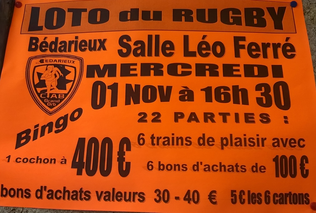 Le jour de la toussaint le CAB Rugby organise une belle partie de Loto à la Salle léo Ferre à 16hs30 ....