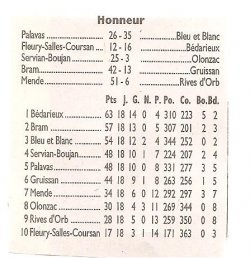Seul le club classé 1° est qualifié direct pour les 1/2 finales , pour les classés de 2 à 7 il y aura qualification par barrage . A ce jour si le classement n'est pas modifié ( punis etc ..) les oppositions seraient les suivantes match A BRAM contre MENDE, match B BLEU BLANC contre GRUISSAN, match C SERVIAN BOUJAN contre PALAVAS . . Les demi-finales pourraient avoir les oppositions suivantes : CAB pays d'orb contre le vainqueur du match C ( servian/ boujan ou palavas ) et l'autre demi finale opposerait le vainqueur du match A et le vainqueur du matcb B . Les barrages auront lieu le we du 14/15 avril et les demi-finales le we du 28/29 avril . 3 semaines de repos forcé pour le CAB PAYS d'ORB ......La finale est programmée pour le we suivant le 6 mai .