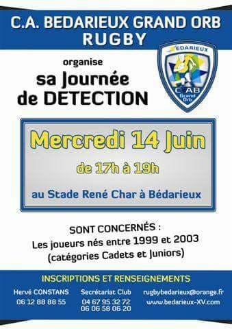 Un journée de détection est prévue le mercredi 14 juin de 17hs à 19hs au stade René Char de Bédarieux ....