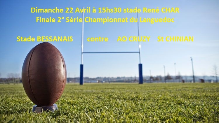 Le comité du Languedoc a confié au CAB rugby Grand Orb , l'organisation de la finale de 2° série qui opposera 2 clubs héraultais : Bessan contre Cruzy St Chinian . Il y aura du monde et de l'ambiance sur les bords de l'Orb ...