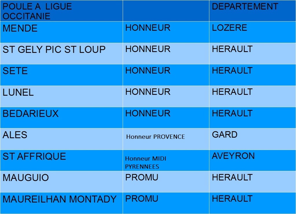 Lrmera ligue de Rugby Occitanie vient de confirmer la poule Honneur A pour la saison 2018/2019 . 2 clubs de nouveaux horizons , Ales et St Affrique , 2 promus Mauguio et Maureilhan Montady et 5 connus ; Mende , Sete ,St Gely Pic St Loup ,Lunel et Bedarieux .... 9 clubs ! Dés la semaine prochaine nous connaitrons le calendrier , le début du championnat est fixé au 16 septembre ......