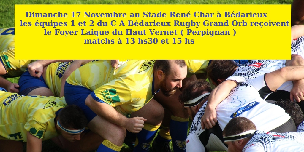 Dimanche 17 novembre à René Char les seniors 1 et 2 recevront les catalans du Foyer Laique du Haut Vernet .Les perpignanais occupent la 6° place de la poule avec 16 points , tandis que les jaunes et bleus pointent à la 8° place avec 12 points .Donc match important pour les joueurs du CABédarieux Grand Orb , s'ils veulent faire une remontée au classement .