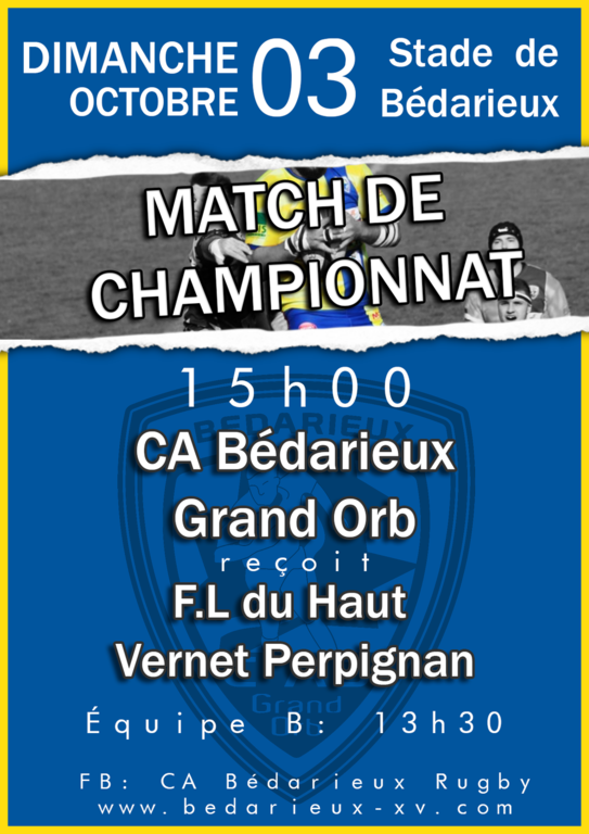 Après avoir reçu le club de l'Union Sigean-Port-la-Nouvelle, le CA Bédarieux reçoit le F.L du Haut Vernet Perpignan. Match qui se jouera Dimanche 03 Octobre au Complexe René Chat à 15h00 pour l'équipe 1, match contre une grosse équipe nous vous attendons donc nombreux pour soutenir le CAB.